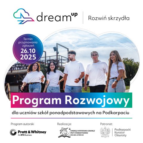 Informujemy, że rekrutacja do programu „DreamUp – rozwiń skrzydła” została przedłużona do 26 października 2026. Uczniowie mogą zgłosić się do programu wysyłając swoje zgłoszenie na stronie https://www.dreamup.prattwhitney.pl/